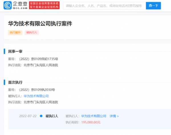 华为被强制执行19.5万 2022-07-26 14:44 Tech星球 华为被强制执行19.5万 Tech星球7月26日消息,近日,华为技术有限公司成被执行人,执行标的19.5万元,执行法院为北京市门头沟区人民法院,案号为(2022)京0109执2030号。