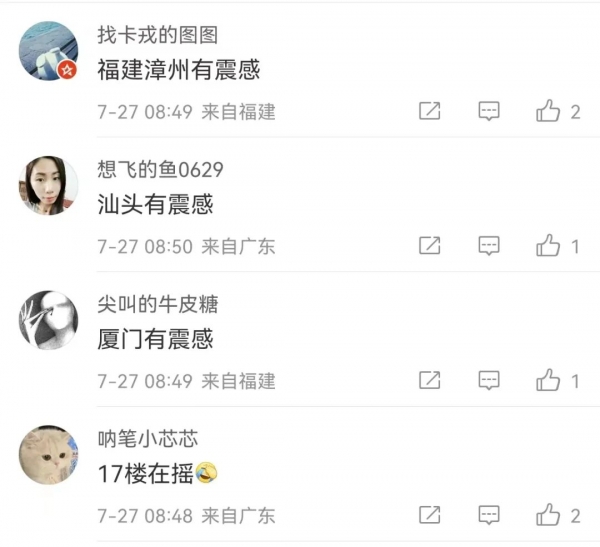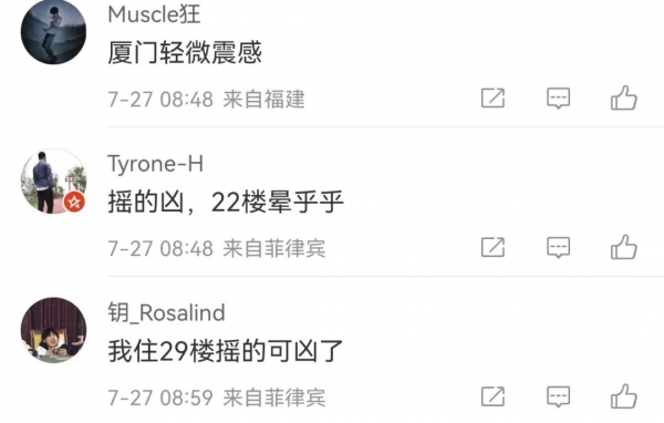 刚刚!菲律宾7级强震!福建多地有震感 2022-07-27 10:40 东南早报 刚刚!7.0级地震!福建多地有震感…… 快讯! 中国地震台网正式测定: 07月27日08时43分在菲律宾 (北纬17.70度,东经120.55度) 发生7.0级地震,震源深度10千米 网友:福建多地有震感