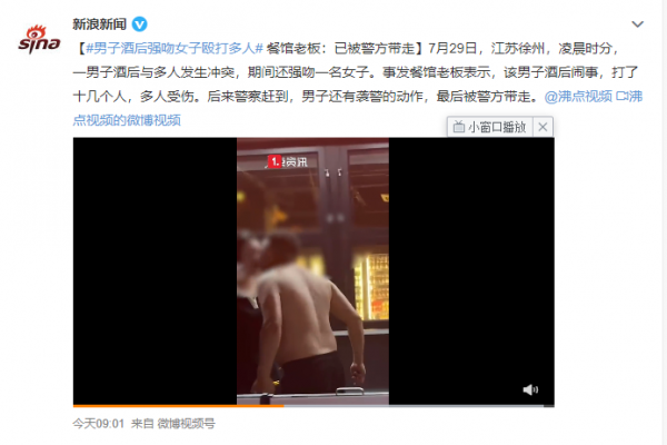 7月29日,江苏徐州,凌晨时分,一男子酒后与多人发生冲突,期间还强吻一名女子。事发餐馆老板表示,该男子酒后闹事,打了十几个人,多人受伤。