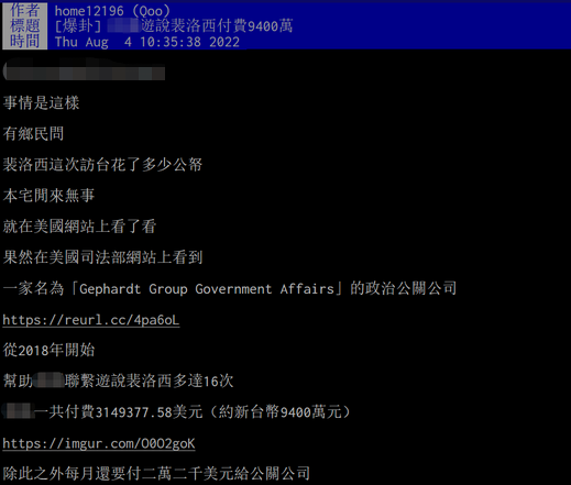 综合"中时新闻网"、"联合新闻网"等台媒4日消息,8月4日上午,有网民在PTT论坛八卦版发文称,他在美国司法部网站查询发现,从2018年2月至今年4月,一家名叫"Gephardt Group Government Affairs"的政治公关公司总共帮助台当局联系游说佩洛西多达16次,下单客户分别为"驻美国台北经济文化代表处"(8次)、台"经济部"(2次)、台"经济部国贸局(3次)以及"民主进步党"(3次)。台当局共为这16次游说支付314.9377万美元,每月还需要额外向"Gephardt Group Government Affairs"公司支付2.2万美元。