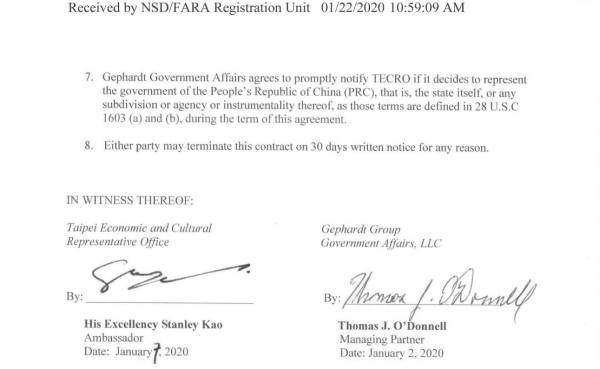 该网民称,从文件上的签名看,可以认出甲方是台前"驻美代表"高硕泰。与台当局合作的公关公司还有Alston & Bird, LLP、Crowell & Moring International, Ltd、Daschle Group, LLC。他在贴文最后讽刺称,"不是说台美关系史上最好吗,怎么还要花这么多纳税人的钱"?