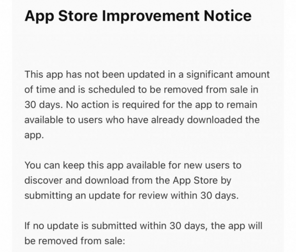 苹果之所以有这般举动,原因在于今年 4 月新发布的一项 App Store 改进政策。内容指出,如果一款 App 在过去三年内未进行更新,或没有达到最低下载阈值,苹果将给开发者发送邮件,通知他们该 App 已确定要被删除。开发者必须在 30 天(后面修改为 90 天)内对该 App 进行更新,如果能通过苹果的审核就能继续在 App Store 上保留。