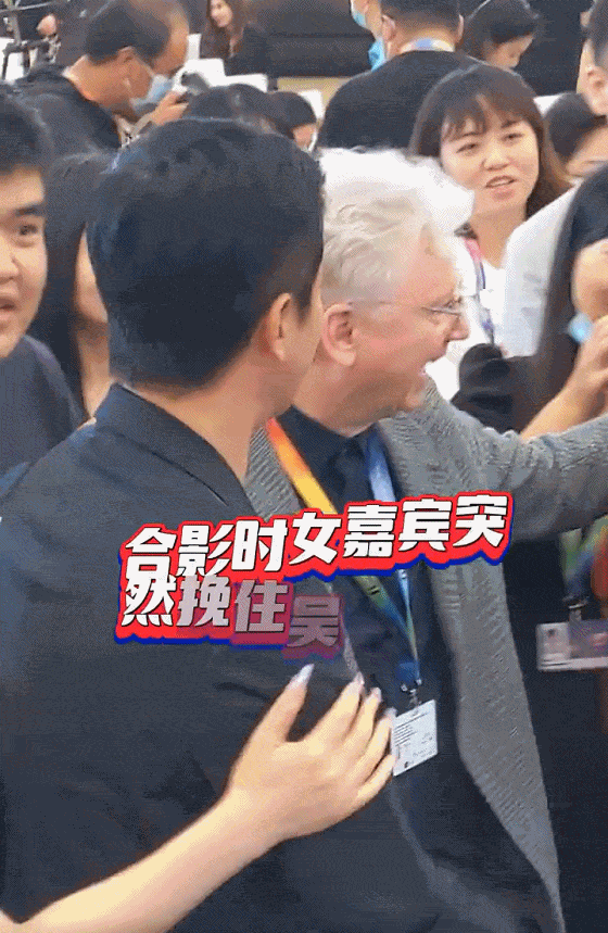 看动图,合影的时候这一位女子是突然挽伸了吴京的右手手臂,发现了之后的吴京瞬间做出了拒绝的手势,并且是直接地做出提手臂的动作飞快的甩开了胳膊。
