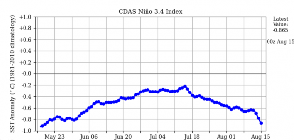 而且根据ERSSTv5数据集也证实了,在7月监测的数据之中显示,热带太平洋 Niño-3.4 区域的海面温度比平均水平低 0.7度。