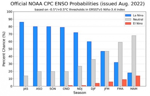 的确,在2022年8月的时候,我们看到拉尼娜现象的发展还在持续,而这一波拉尼娜现象是"第二波"的拉尼娜现象。