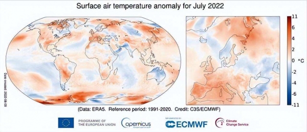 当然,全球性的高温袭击,也使得2022年7月是有记录以来最热7月的第二名,比1991-2020年参考期高出近0.4摄氏度,略低于2019年7月,但略高于2016年7月。