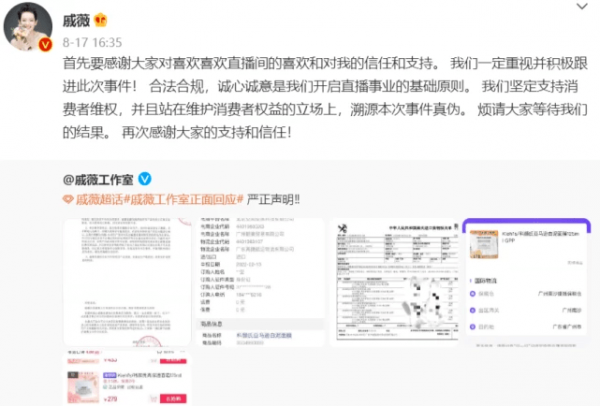 随后戚薇工作室否认卖假货,称所卖的产品均来自合规渠道,并承诺如果购买的产品确定是假货,会假一赔十,但也不容许任何背离事实的指控,希望对方能够将产品寄回,由他们负责去鉴定。