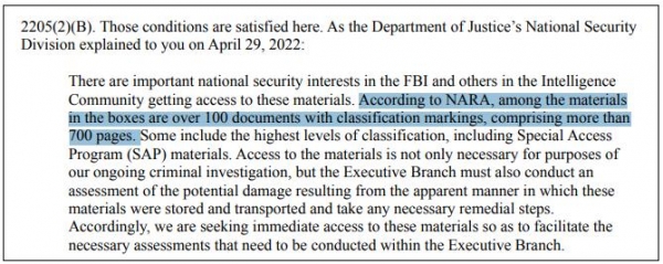 其中提到,司法部4月29日向特朗普律师提及,已搜出100多份文件,超过700多页的机密材料