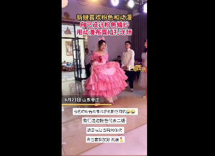 8月23日,山东枣庄。一新娘穿着粉色婚纱举行婚礼仪式引热议,有人称婚纱店滞销款终于被卖出去了,更有甚者认为粉色不适合初婚者穿。新娘却称,她喜欢粉色,也喜欢动漫,就亲手画图设计。