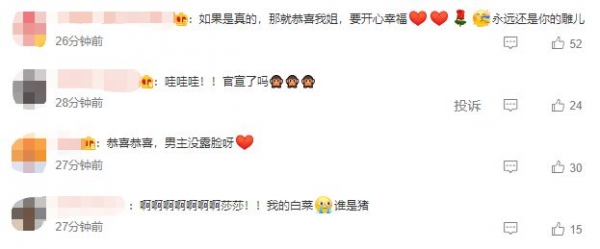 不少粉丝和网友都激动地送上祝福,表示"如果是真的,那就恭喜我姐,要开心幸福","恭喜恭喜,男主没露脸呀","哇哦,恭喜莎莎子,谁这么好福气",看来大家都对男方的身份十分好奇。