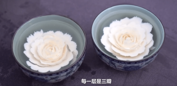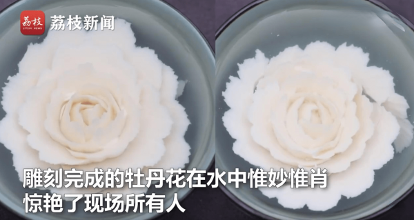 一块嫩豆腐放进水中,吴昊南用手中的刻刀只需3分多钟,一朵惟妙惟肖的牡丹花就雕刻完成。
