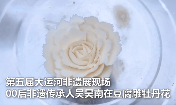 9月10日,据贰河视频报道,近日,在江苏淮安第五届大运河非遗展现场上,00后非遗传承人吴昊南在豆腐上雕刻牡丹花,惊艳了众人。