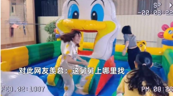 据潇湘晨报报道,9月12日,陈女士介绍,看到弟弟买了这个充气城堡回来很意外,感觉放在家里玩的话比较不实际。"因为平时都是去外面花五块钱、十块钱玩一次。"陈女士调侃,"当时看到了好羡慕我儿子,我也想想要有这种舅舅。"