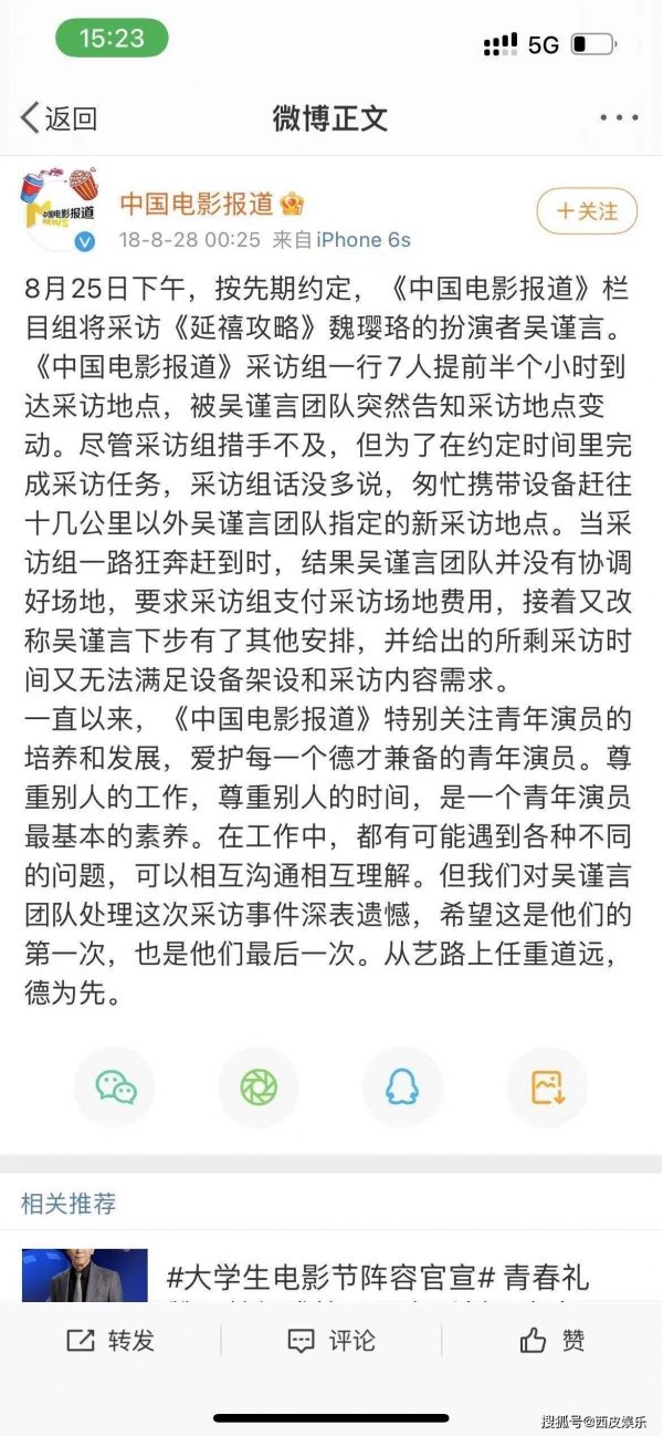 吴谨言靠《延禧攻略》一炮而红之后,她的人气爆棚,待遇也变好了许多。中央六组也邀请了吴谨言进行采访,可当记者提前半个小时到达约定地点后,却迟迟不见吴谨言的身影,随后就被告知,采访地换成了吴谨言的住所。而等到记者又匆忙带着设备,狂奔十几公里赶到地方时,吴谨言团队又提出各种要求,并让采访组支付场地费,还说吴谨言有其他安排,现在没时间接受采访。