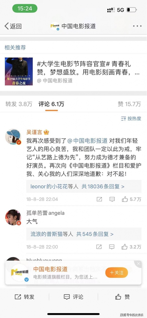 吴谨言以及她团队的此番操作让央视采访组十分气愤,直接凌晨在网上公开点名批评,丝毫不给吴谨言留面子。吴谨言在被点名之后,立马向央视道歉,表示自己和团队一定会以此为戒,牢记"从艺路上德为先"。
