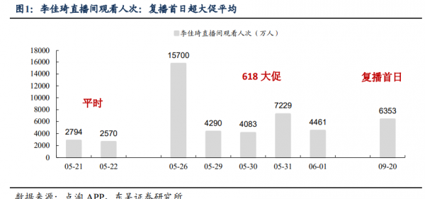开播后,李佳琦复出的消息在朋友圈、微博等社交媒体流传开来,得知消息的网友开始涌入直播间。开播半小时,场观便已经达到500万,一个小时后达到2100万,两小时后直播结束时,最终观看量超过6350万,点赞量超过1.6亿。