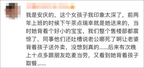 评论中获得最高赞的网友表示,自己就是安庆的,对这个女孩子印象深刻,"前两年上班的时候,下午茶点瑞幸就是她送来的,当时她背着个好小的宝宝,我们整个售楼部都震惊了……后来有次晚上十点多跟朋友吃麦当劳,又看到她背着孩子取餐……"