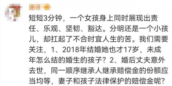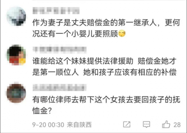 还有很多法律意识较强的网友,就"婆婆拿走全部赔偿金"一事提出质疑,认为婚后丈夫意外去世,同一顺序继承人继承赔偿金的份额应当均等,更何况小陈还有一个小婴儿要照顾,是否可以通过法律援助去争取一下赔偿金。