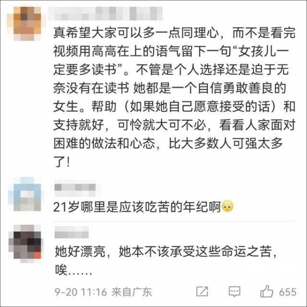 有人则表示十分心疼小陈,"21岁哪里是应该吃苦的年纪。"有人说,"不管是个人选择还是迫于无奈没有在读书,她都是一个自信勇敢善良的女生",并直言,小陈面对困难的做法和心态,比大多数人强太多了。
