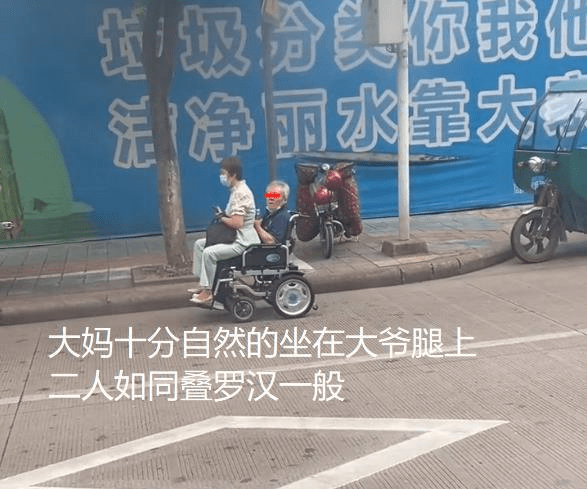 只不过令人想不到的是,这位大爷坐在电动轮椅上时,一位穿着十分时尚的貌美大妈也是很自然地坐在了大爷的腿上,两位老年人就如同叠罗汉一般,全部的重量全部压在了这辆电动轮椅上。