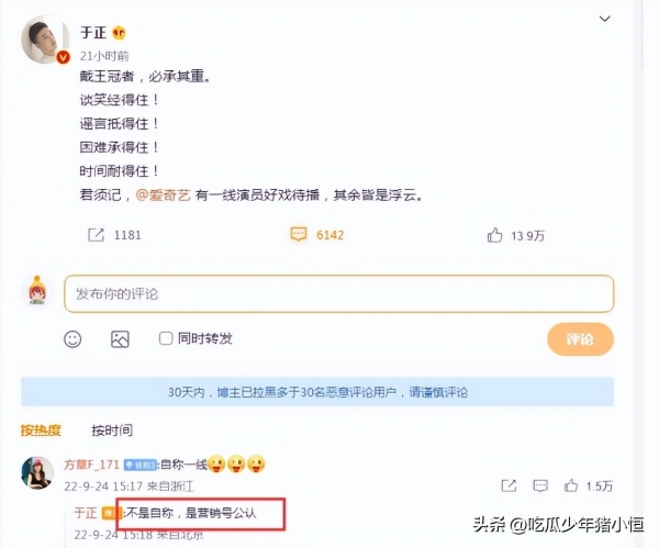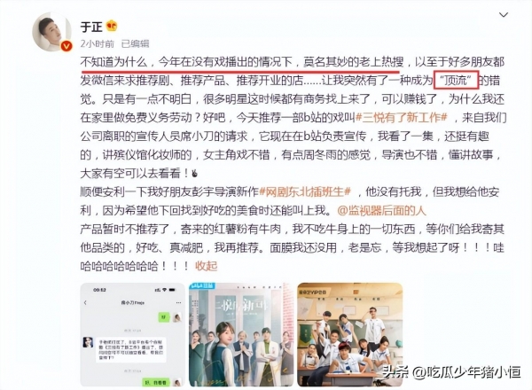 总之,这娱乐圈就没有于正蹭不上的热度,被他蹭了热度不说,最后他还反问一句:"最近总是莫名其妙上热搜,也没有什么剧,感觉自己有一种顶流的错觉"。
