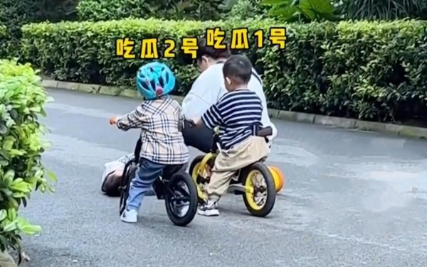 这个时候,两个吃瓜群众骑着平衡车先后来到了现场,也是两个小孩子,比躺地上打滚的宝宝稍微大一些。
