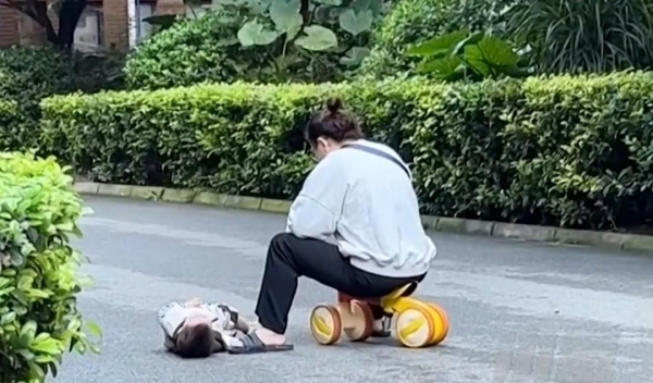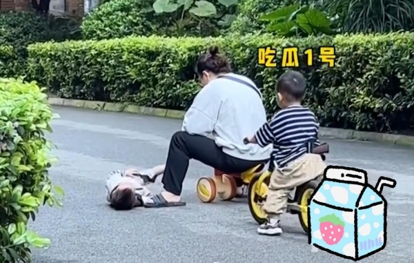 在某小区的居民楼下,发生了这么有趣的一幕。一个萌娃躺在地上哭闹,旁边的妈妈却无动于衷,坐在扭扭车上刷手机。