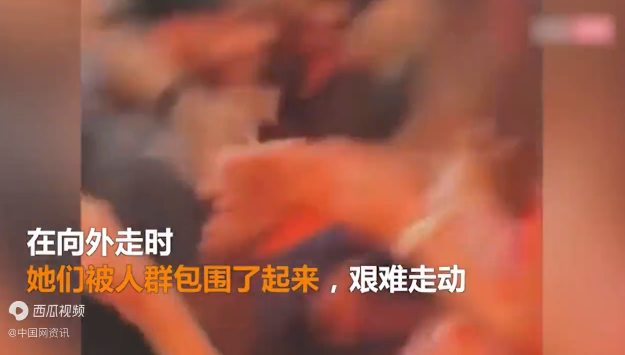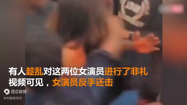 在向外走时她们被人群包围了起来,在人堆中艰难移动着,有人趁乱对这两位女演员进行了非礼。