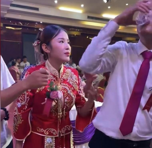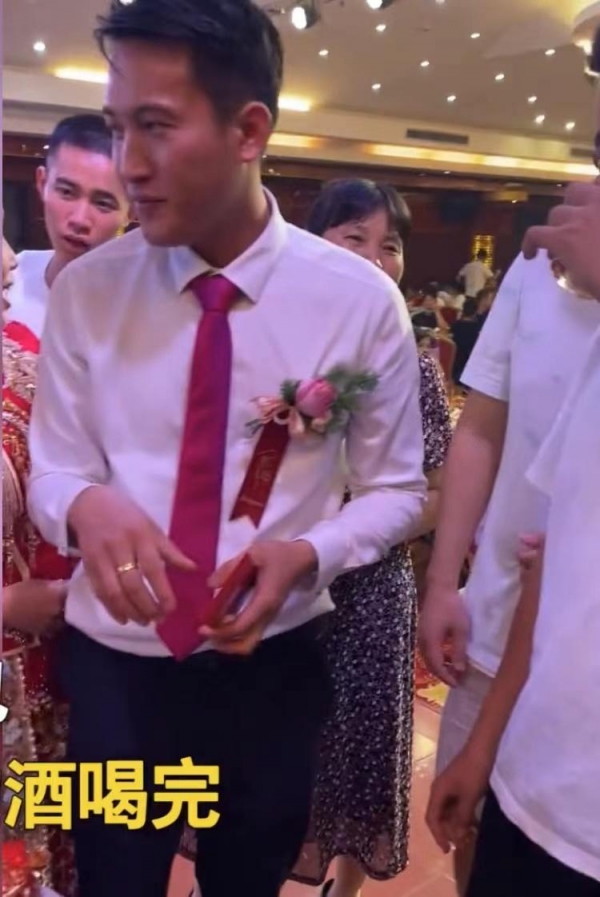 小伙子酒量不错,一杯接一杯,很快就喝了好几杯,拿到了不少的红包,当新郎又拿起其中一个杯子一饮而尽的时候,新娘终于撑不住了,小心地用手拉扯老公的手臂,示意他悠着点,别喝坏了身体。