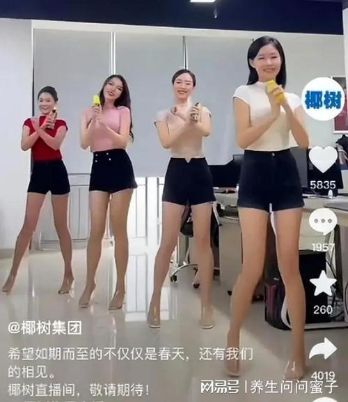 直播间里,丰满的主播均穿着紧身彩色上衣搭配黑色短裤,露出大长腿挑起热舞,为椰树牌椰汁带货。