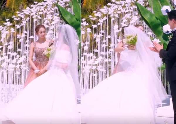 画面中,只见海陆站在新娘张檬身侧静静听着新娘对她说的话。这个时候,海陆听得很是感动,表情下一秒就要哭出来的模样让我们不禁也身临其境地跟着感动起来。然后新娘张檬将手中的花束交给了海陆并表示着希望将这份心意传递给她,海陆也是非常愉悦的接下花束并拥抱了新娘,可见两人的友谊真是亲密无间。