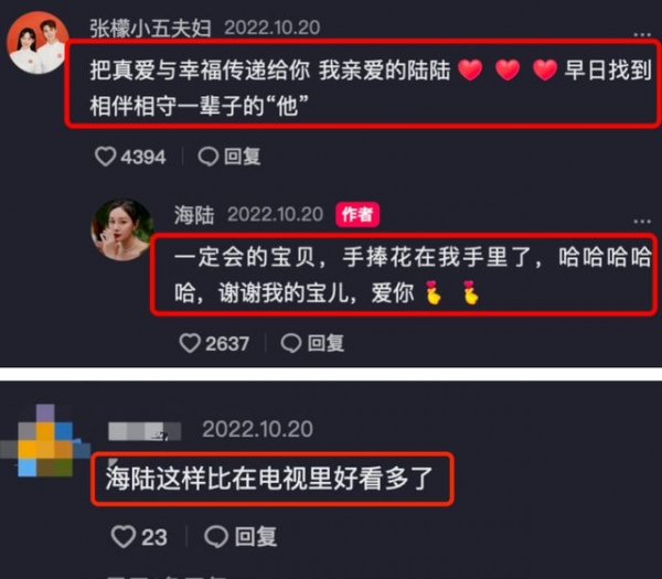 不仅如此,张檬私下还特意在海陆视频下方评论区留言道"把真爱与幸福传递给你 我亲爱的陆陆,早日找到相伴相守一辈子的他",海陆也是立马热情回应了张檬。其中,还有网友对于海陆平时私下的造型很是认可,甚至认为她剧中的模样都没有私下的她美。