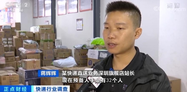 某快递直送业务深圳旗舰店站长 蒋辉辉:正常 14 个人就够了,现在预备人手是有 32 个人,通过亲戚朋友介绍,公司也有专门的招募人员,薪资还是挺高的,每天少的话有四五百元,多的话七八百元,目前看人手还需要增加。