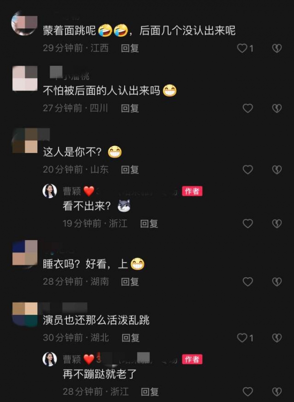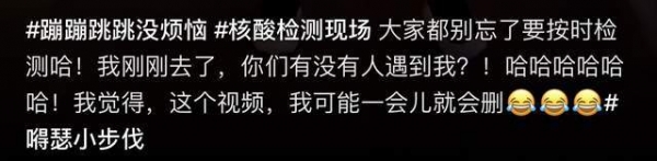 曹颖发文提醒大家都要按时去做核酸,还询问有没有路人认出她?也许是她觉得跳的舞有些滑稽,在文末还表示自己可能马上就会删除这条动态。