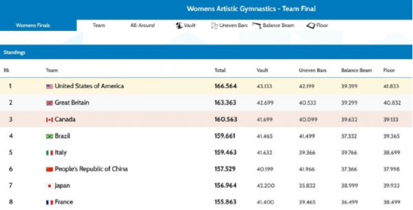 而作为卫冕冠军的美国队,表现强势,拿到了三个单项第一,总分166.564分摘得金牌,实现了六连冠。英国队拿到了银牌,而在资格赛表现不佳、仅排名第8的加拿大队完成了逆袭,获得铜牌,这三支球队,也拿到了巴黎奥运会的参赛资格,可谓是大丰收。