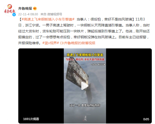 只因发生得太快 ,当时只感觉车子被什么东西给砸中了,等他停下车来查看时,他才看清原来是一块钢板,好在没出什么事,想想都后怕。