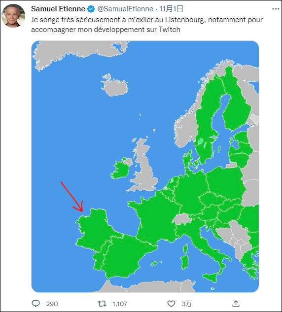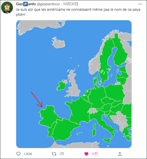 10月30日,法国博主Gaspardo在推特上晒出了一张地图,他在地图上P上了一个和西班牙、葡萄牙接壤的国家,并用红色箭头标识出来。