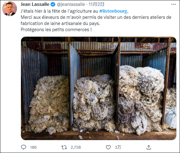 法国前国会议员、2022年总统大选候选人约翰·拉萨尔也发文写道:"我昨天参加了里斯腾堡的农业节。感谢饲养员允许我参观该国最后一家手工羊毛车间。保护小企业!"