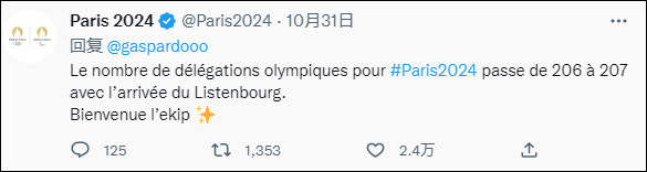 2024年巴黎奥运会官方账号也发文:"随着里斯腾堡的加入,参加2024年巴黎奥运会代表团的数量从206个涨至207个。欢迎!"