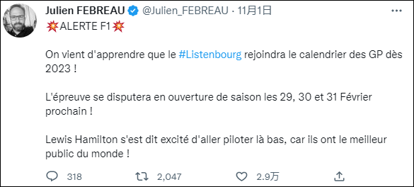 体育评论员朱利安·费布罗(Julien Fébreau)则公布喜讯:"2023年F1锦标赛将在里斯腾堡举行,刘易斯·汉密尔顿(F1赛车手)说他很高兴能去那里比赛,因为那里有世界上最好的人。"