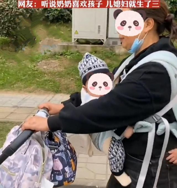 于是,小区里的人经常能看到这样一幕:一个老太太推着婴儿车,前面抱着、后面背着,带着三个孙子在溜达。