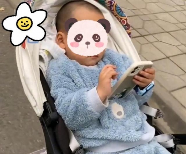 至于大孙子躺在婴儿车里玩手机,也没有人忍心去指出来,小孩子玩手机不好。