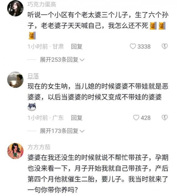 有网友评论说,小区里有一个老奶奶,三个儿子,生了六个孙子,老奶奶天天喊:我怎么还不死啊?