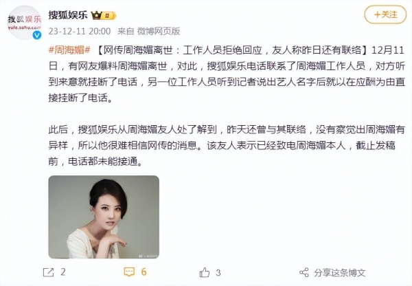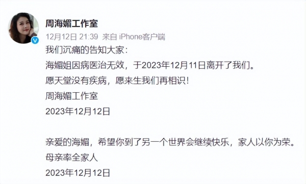 周海媚的工作室发文称周海媚已于12月11日病逝,这也就是说爆料人的爆料是真的。