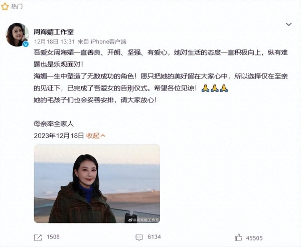 到了12月18日,周海媚工作室发文称周海媚的告别仪式已经低调完成。