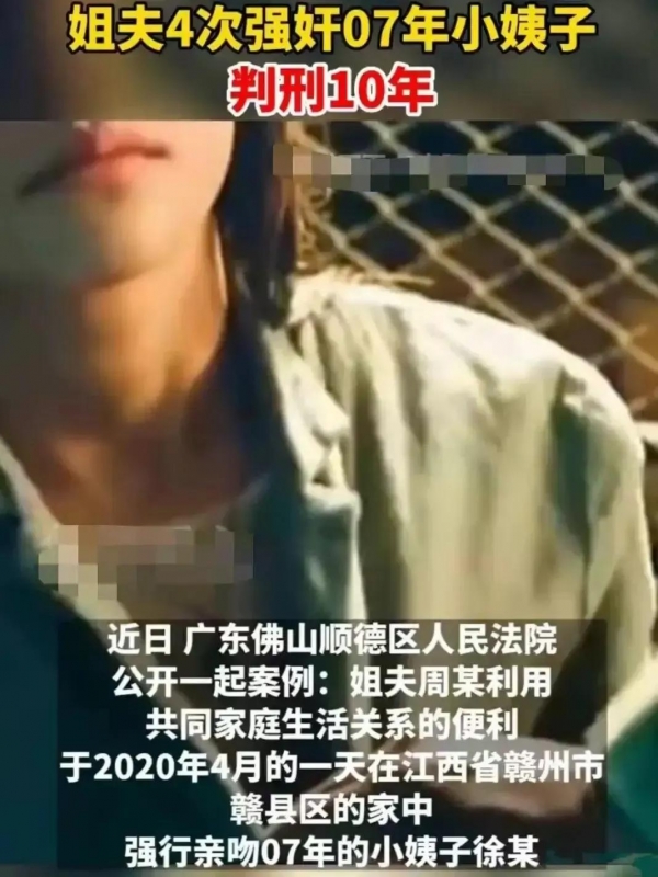 近期,一则名为"姐夫四次强奸07年小姨子判刑十年"帖子登上了热搜,引发激烈讨论,新闻中称,姐夫周某利用共同家庭生活关系的便利,在2020年4月至2021年8月对04年的小姨子小玲强行亲吻,强奸,摸胸部,数罪并罚判处有期徒刑十年。