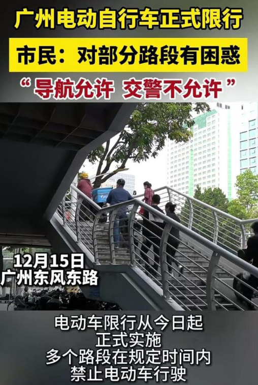 2023年12月15日起,广州市正式实施《广州市人民政府关于电动自行车通行管理措施的通告》,根据该通告,对电动自行车的上路时间和区域做了限制,部分路段限制使用电动自行车,部分路段允许分时上路。