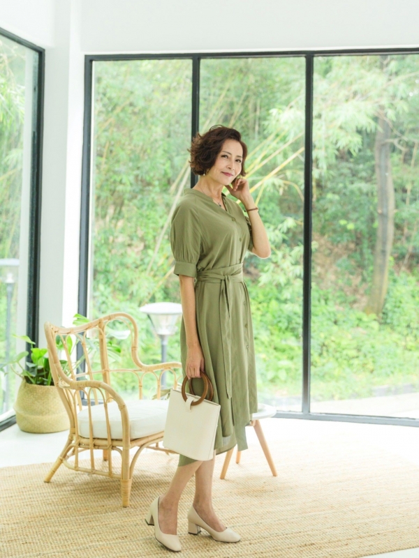 夏天仿佛更适合清新一点的颜色,绿色系再加上中间腰带的点缀,有着不错的收腰效果,再加上头发的设计,稍微短款还有点卷,很时髦了。