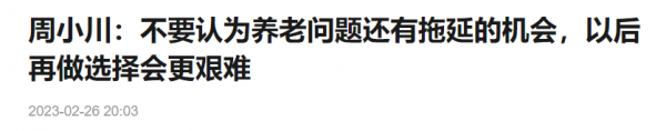 在"第五届全球财富管理论坛"上,央行前行长周小川表示,"不要认为养老问题还有拖延的机会,以后再做选择会更艰难"。