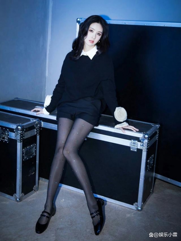 在这组照片中,陈都灵身穿一身黑色的短裙,搭配上黑丝袜和一双黑色的高跟鞋。她的妆容简洁而精致,凸显了她美丽的五官和优雅的气质。她的长发自然地披散在肩头,与整个造型相得益彰。